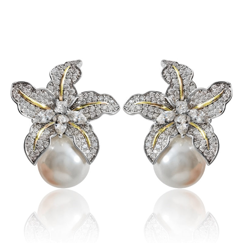 Gorgeous Flower Imitation Pearl Earrings Luxury Inlaid Sparkling CZ Stone Fashion Wedding Jewelry