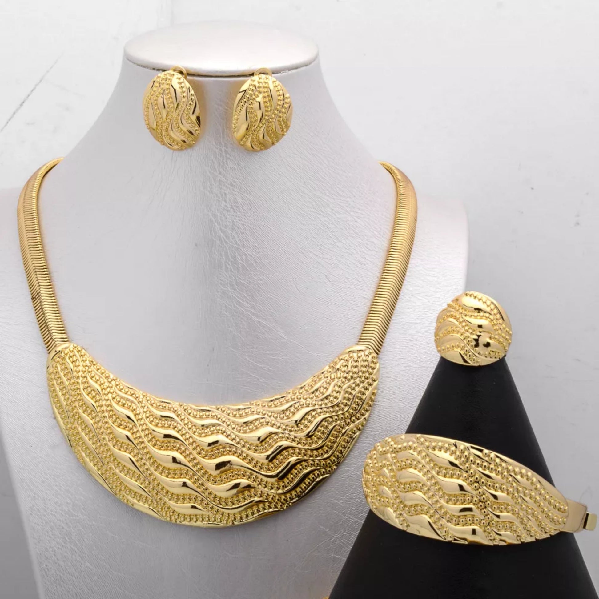 This set of jewelry for women is an elegant piece which is ideal for any occasion. This stunning set is made with high quality materials and is beautifully designed. The bright colors and intricate designs will make your outfit look more stylish. You can also wear this set to feel sophisticated and glamourous. This set is made from the finest materials which are durable and will last a long time.