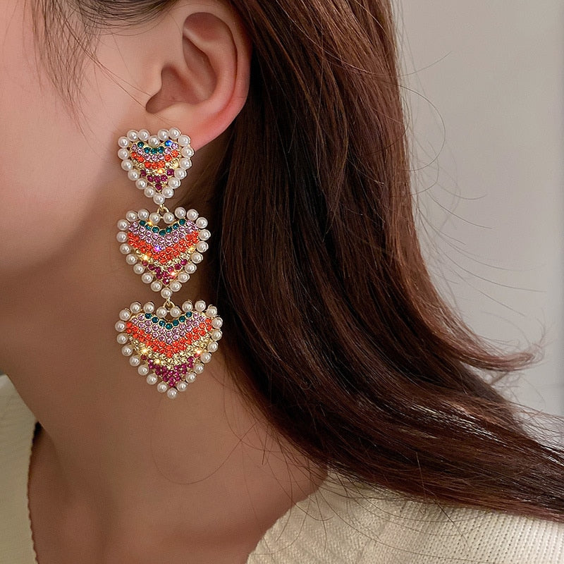 Sweet Pearl Love Heart Colorful Rhinestone Dangle Earrings Style HF4UE7162